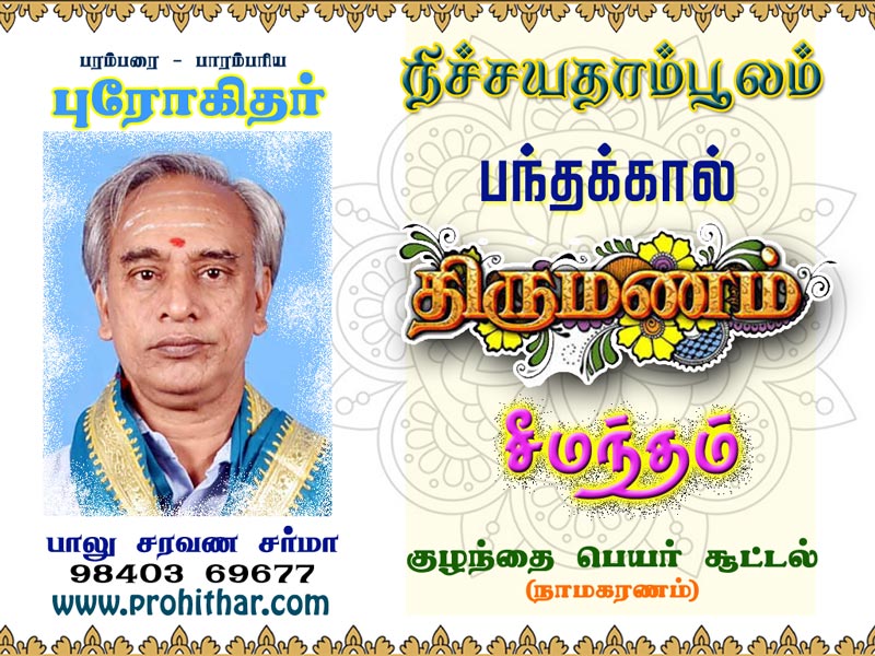 Progithar, Prohithar, priest, Pandit, Iyar, Balu Saravana Sarma, jothidar, Astrologer, Kalyanam, vivaham, Subamuhurtham, samagri, thirumanam material, Item List, hindu wedding, Pooja list, reddy wedding, desur, pantakapulu, pokanadu, kanja, reddiyar kalyanam, reddiyar thirumanam, naidu, kammavar, balija, balja naidu, yadaval, golla naidu, chettiyar, vaniya chetty, komitti, beri chetti, nattakkottai, rajulu, chatriya kulam, naikar, nayakar, telugu raju, vaisyakula wedding pooja list, mudaliyar wedding, pillai, saivapillai, agamudayar, senkundar, arcot mudaliyar, veera saiva vellalar, thondaimandala, thuluva, pillaimar, karkathar, idayar, nadar, nattar, devar, mukkulathor, pallar, konar, udayar, yadav, gounder wedding list, kongu vellalar, gounder, seer karuneegar, kanakku pillai, Servai, Maravar, Naicker, devendra kual vellalar, adi dravidar, adhi dravidar, harijan, vannar, yekali, visvakarma, achari, tamil nadu wedding ritual, procedure, method, pandakkal, arasanaikkal, nitchayathambulam, nichathartham, janavasam, mappillai azaippu, mulappari, pada poojai, pandal, manamedai, kasi yatirai, kasi yatra, kula daivem, kalyana Panai, manamagal, manamagan, betrothal, bride, bridegroom, saptapadi, saptarishi, agni kundam, kanniga danam, panigrahanam, gowri pooja, thirumangalyam, mettai, pottu, jilagara bellam, unjal, nadaswaram, melam, arathi, kalyanam, machan, pori mothiram, kalayana malai, akshathai, muhurhta Lagnam, muhurtha naal, subadinam, nalla nal, kuligai, gahu kalam, yamakandam, auspicious time, shanthi muhurtham, seer varisai thattu, nalungu, mulai pari, kudavilakku, abishegam, kamakshi vilakku, mukkali, poojai porul, asirvadam, kandarvan, soman, agni, vishnu, vivaha mantram, thiru mangalyam, A to Z, wedding package, suite, service wedding package amount, புரோகிதர், புரோஹிதர், அய்யர், குருக்கள், குருக்குள், சிவாச்சாரியார், பிராமணர், வேதம், பாலு சரவண சர்மா, தாம்பரம், ஜோதிடர், நல்ல நேரம், முகூர்த்த நேரம், லக்னம், சுப ஹோரை, நல்லநாள், முகூர்த்த தேதி, நட்சத்திரம், சந்திராஷ்டமம், செவ்வாய் தோஷம், சர்ப தோஷம், மணமகள், மணமகன், மைத்துனர், தோழி, தோழன், நிச்சயதாம்பூலம், நிச்சயதார்த்தம், ஒப்புதாம்பூலம், பந்தக்கால், மணமேடை, முக்காலி, அரசானைக்கால், அம்மி, அருந்ததி, சப்தரிஷி மண்டலம், மெட்டி, திருமாங்கல்யம், தாலி பொட்டு, நாகவல்லி, திருமாங்கல்ய நூல், திருமாங்கல்ய கயிறு, மஞ்சள், குங்குமம், திலகம், மாலைமாற்றல், கொங்குமுடி, முந்தானை முடிச்சு, வலம் வருதல், வரவேற்ப்பு, மணப்பெண், மருமகன், பாதபூஜை, ஊஞ்சல், மோதிரம் மாற்றுதல், திருமண சடங்குகள், திருமண முறைகள், திருமண சம்பிரதாயம், குலதெய்வம் வழிபாடு, மணப்பொங்கல், படையல், சுமங்கலி பிரார்த்தனை, சீர்வரிசை தட்டு, பொன்னுருக்கல், பொன் உருக்கல், அஷதை, மஞ்சள் அரிசி, ஆசீர்வாதம், கன்னிகாதானம், அக்ஷதை, பானிக்கிரஹணம், தாரைவார்த்தல், சம்பந்தி, வலம் வருதல், தீபம், காமாட்சி விளக்கு, கிளைவிளக்கு, மாவிளக்கு, கூரைப்புடவை, இரட்டை தாலி, பட்டம், வெள்ளி பூநூல், பூஜை பாத்திங்கள், பன்னீர்புட்டி, குங்குமசிமிழ், காசியாத்திரை, குடை, தட்டு, சொம்பு, ஆலம், ஆரத்தி, முகூர்த்த தேங்காய், சுபமங்களம், பாலும் பழமும், அக்னி குண்டம், யாகம், தர்பை, ரெட்டியார் திருமண சடங்கு சம்பிரதாய முறை பொருள் பட்டியல், வன்னியர் திருமண சடங்கு சம்பிரதாய முறை பொருள் பட்டியல், முதலியார் திருமண சடங்கு சம்பிரதாய முறை பொருள் பட்டியல், நாயக்கர் திருமண சடங்கு சம்பிரதாய முறை பொருள் பட்டியல், நாயுடு திருமண சடங்கு சம்பிரதாய முறை பொருள் பட்டியல், செட்டியார் திருமண சடங்கு சம்பிரதாய முறை பொருள் பட்டியல், யாதவாள் திருமண சடங்கு சம்பிரதாய முறை பொருள் பட்டியல், ராஜூல
