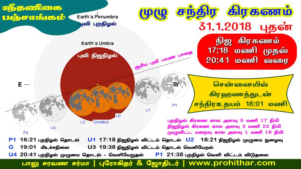 பூர்ண சந்திர கிரஹணம்: 31.1.2018 புதன் ராகு நிற்கும் கடகராசியில் பூசம், ஆயில்யம் நட்சத்திரத்தில் சந்திரன் இருக்க இந்த முழுசந்திர கிரகணம் நிகழ்கிறது. சந்திர கிரகணம் என்பது சூரியன் - பூமி - நிலவு நேர்கோட்டில் வரும்காலத்தில் புவியின் நிழலால் நிலவிற்குசூரியனின் நிழல் தடுக்கப்பட்டு நிழல் தன்பொலிவை இழந்து இருண்ட நிலையில் தோற்றம் அளிப்பதாகும். முழுநிலவு தினத்தில்தான் சந்திர கிரகணம் நிகழும். அதுவும் பவுர்ணமி முடிவில் பிரதமையின் துவக்கத்தில் தான் கிரகணம் நிகழும் நிஜகிரகண காலம்: அன்று 17:18 மணி (சூரிய அஸ்தமனம் முன்னர்) முதல் இரவு 8:41 வரைத்தான் நிஜமான புவியின் நிழலால் நிலவு மறைக்கப்படுகிறது. இக்காலமே சாஸ்திரரீதியாக கிரகண தோஷகாலமாகும். உதய சந்திரனே கிரஹணதோற்றத்துடன் இருக்கும். அன்று சென்னையில் சந்திர உதயம் மாலை 6:01 கிரகண பரிகார நட்சத்திரங்கள் கிரகணம் சம்பவிக்கும் பூசம், ஆயில்யம் அதன் முன் பின் நட்சத்திரங்களான புனர் பூசம், மகம், இதன் திரிகோண நிலை நட்சத்திரங்களான அனுஷம், கேட்டை, உத்திரட்டாதி, ரேவதி நட்சத்திரத்தை சார்ந்தவர்கள் கிரகண முடியும் காலத்தில் அல்லது மறுநாள் தங்களால் இயன்ற அரிசி, பருப்பு, நல்லெண்ணைய் ஆகியவற்றை வேதபாடசாலைக்கு தானம் செய்து அருகில் உள்ள கோவிலில் துர்கைக்கு அர்ச்சனை செய்யவும் (ராகுவின் தெய்வம் துர்கை). போஜனம்: பகல் போஜனம் தவிற்கவும் சிரார்தம்: பௌர்ணமி திதி சிரார்தத்தை அடுத்தநாள் பிரதமையில் செய்யவும் தர்பணம்: கிரஹணம் விடும் நேரத்தில் தானம், தர்பணம் செய்தல் நன்று கிரஹண ஸங்கல்பம்: "ஸோம உபராக ச்ரார்தம் திலதர்பண ரூபேண அத்யகரிஷ்யே" சாந்திரமானம்: ஹேமலம்ப, உத்ராயணம், சிசிரருது, மாக சுத்த, பௌர்ணமி, ஆயிஷ்லேஷா நட்சத்திரம், ஆயுஷ்மான் யோகம், பாலவ கரணம் சௌரமானம்: ஹேமலம்ப வருஷம், உத்ராயணம், ஹேமந்த ருது, மகர மாஸே, பௌர்ணமி, ஆயிஷ்லேஷா நட்சத்திரம், ஆயுஷ்மான் யோகம், பாலவ கரணம் பாலு சரவண சர்மா, பழைய தாம்பரம் கிராம பரம்பரை புரோகிதர்-ஜோதிடர் |