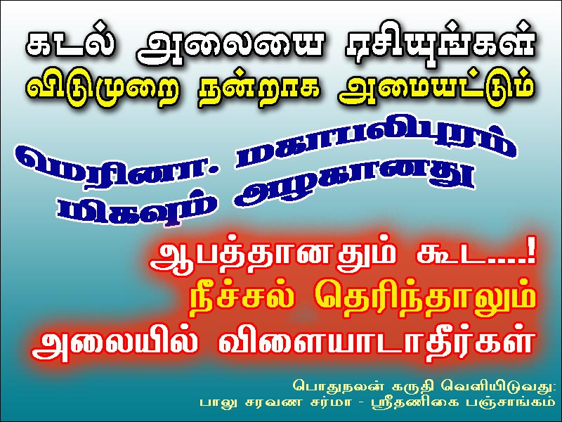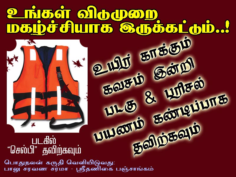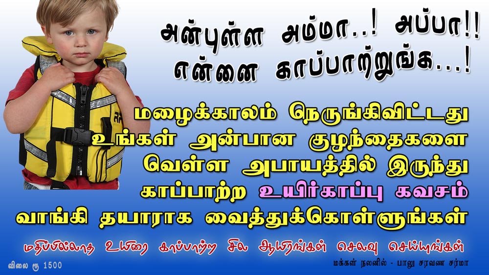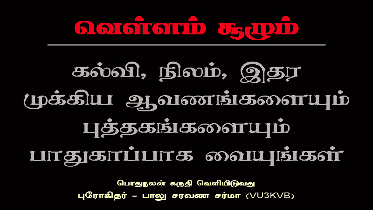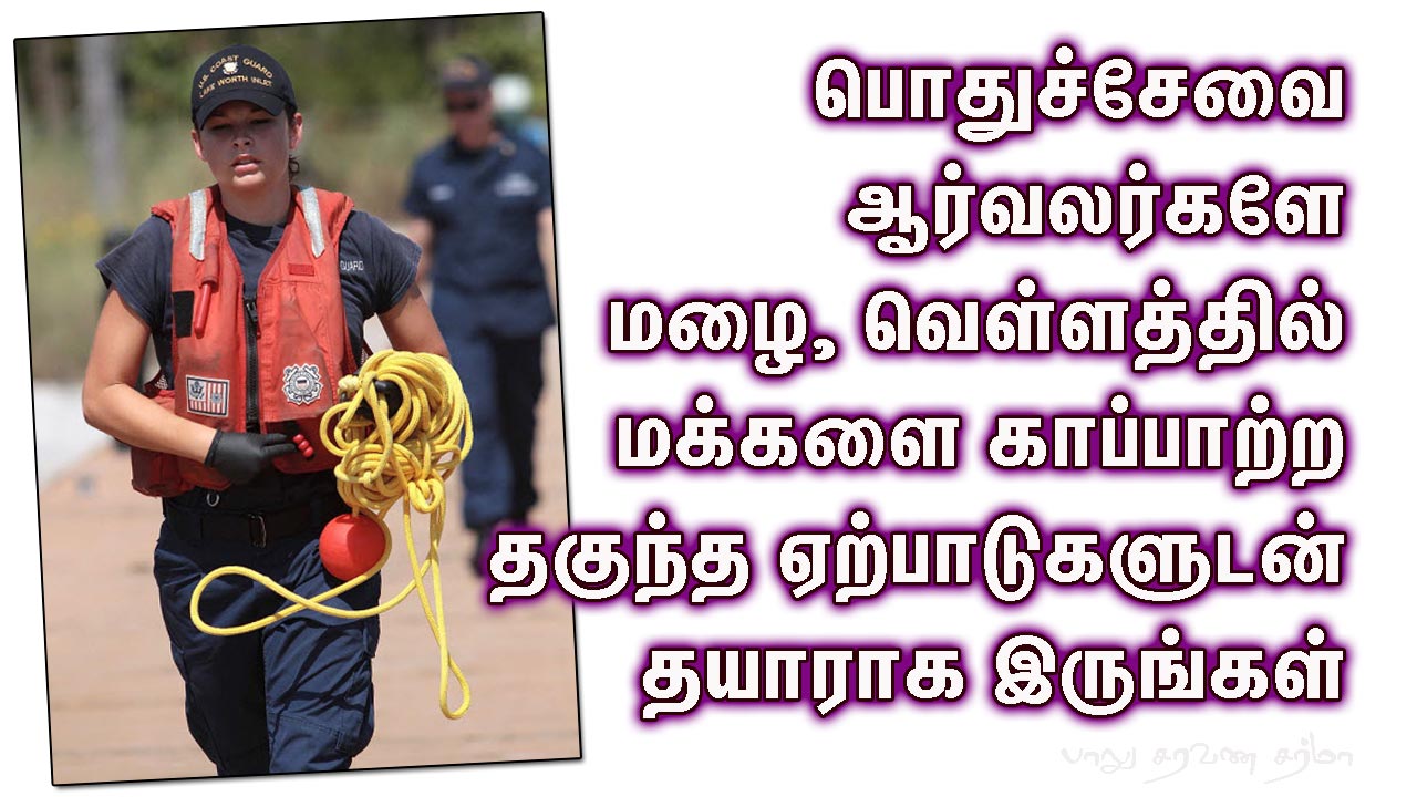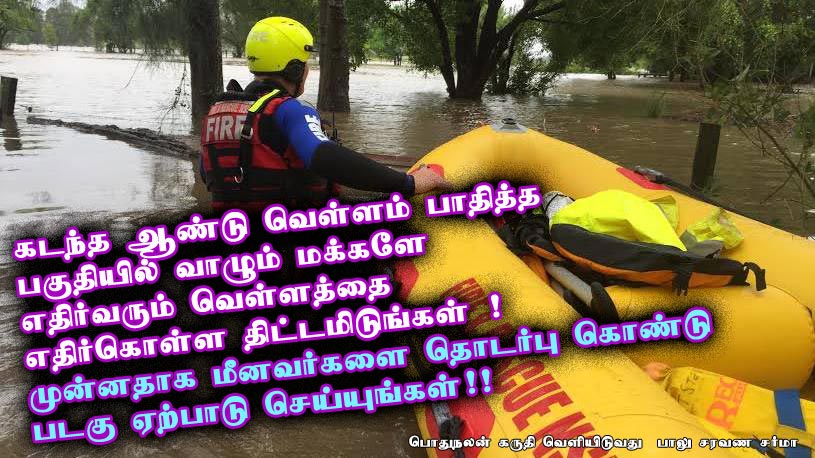 மழை வெள்ளக்காலங்களில் எப். எம் ரேடியோ சரிவர வேலை செய்யாது. எனவே ஏ.எம் ரேடியோவை பயன்படுத்துங்கள். தேவையான பாட்டரி வாங்கி வைத்துக்கொள்ளுங்கள் குழந்தைகளை காப்பாற்ற முனையுங்கள் முன்னெச்சரிக்கையாக வெள்ளம் வரும்முன் உயிர்காப்பு கவசங்களை குழந்தைகளுக்கு வாங்கி தாருங்கள் கடும் மழை, வெள்ளம், புயல் இவற்றிலிருந்து உங்களின் மதிப்பு மிக்க ஆவணங்களை காப்பாற்றுங்கள். தகுந்த முன்னெச்சரிக்கை நடவடிக்கை எடுத்து வெள்ளம் பாதிக்காத பகுதியில் வாழும் உறவினர்கள், நன்பர்களிடம் ஆவணங்களை தந்து பத்திரப்படுத்துங்கள். மிகவும் முக்கியமான பணிகளில் இதுவே முதன்மையானது. மழை வெள்ளம் காலங்களில் தேவையான வானொலிபெட்டி, டார்ச், பேட்டரி, மெழுகு வத்தி, பால்பவுடர், மண்ணெண்ணைய் ஆகியவற்றை தயாராக வைத்திருங்கள். பிஸ்கட், நீர் ஆகியவை முகவும் முக்கியமானதாகும். தன்னார்வலர்களே தயாராக இருங்கள், தொண்டு நிறுவனங்களே தேவையான பொருட்களை சேகரித்து வைத்துக்கொள்ளுங்கள் மின்தடையால் மோட்டார் வேலை செய்யாது எனவே தேவையான குடிநீரை சேமித்து வையுங்கள் lifejacket, safety, beach, boat, child safty, tour, Tambaram, Ooty, parisal, play, mahabalipuram மெரினாவில் பாதுகாப்பாக குளியுங்கள், பாதுகாப்பு கவசம் இன்றி படகில் பயணிக்காதீர்கள் Fire Escape Ladder, Chennai, Fire Safety for Flats, fire extinguisher, First Aid Kit Tamil Nadu Fire and Rescue Service, Tambaram Fire Station Phone: 101, 044 22382204, 9445086053 Amateur radio emergency service india, VHF - UHF Repeater Frequency,, Hamradio, Tambaram, Chennai, Tamil Nadu, India, WPC Exam, Rules, Syllabus, Q Codes, Morse Code, AM, SSB, USB, FM, DSTAR, Digital, SSTV, CW, NET, HF, 40 Meter Band, VU3KVB, QSL, Di