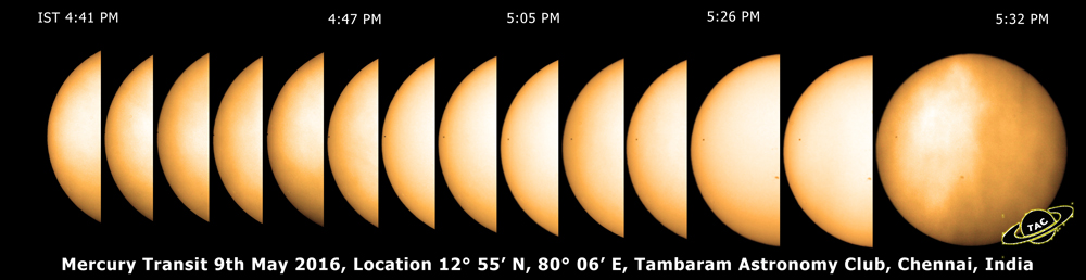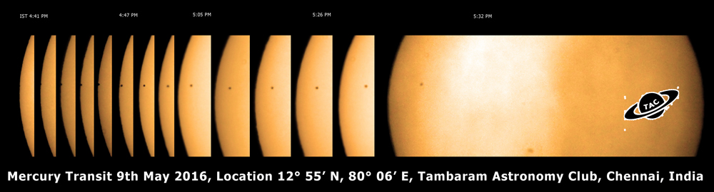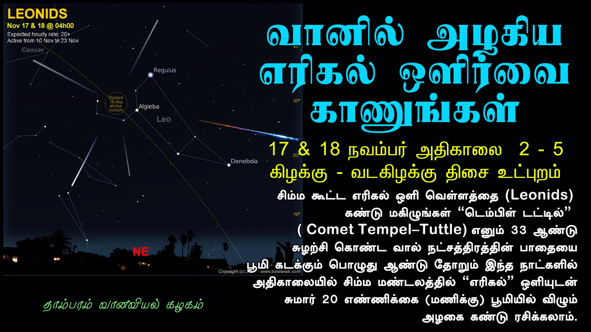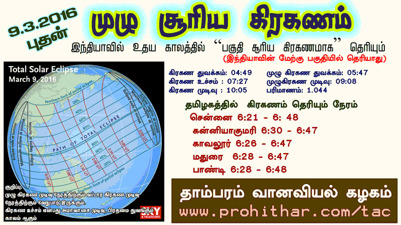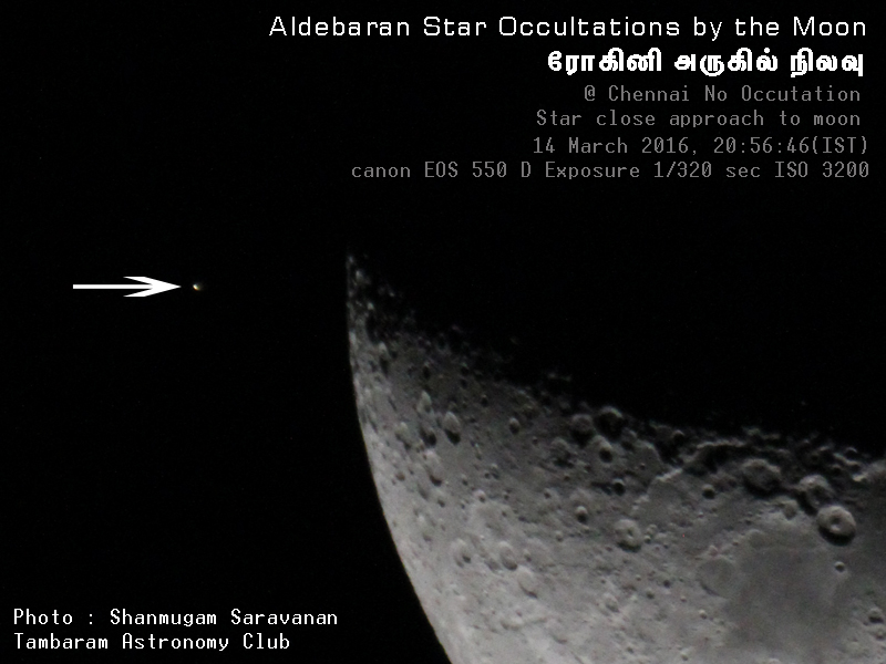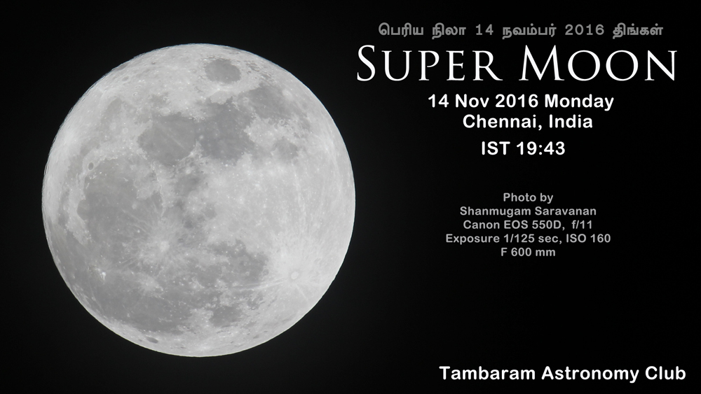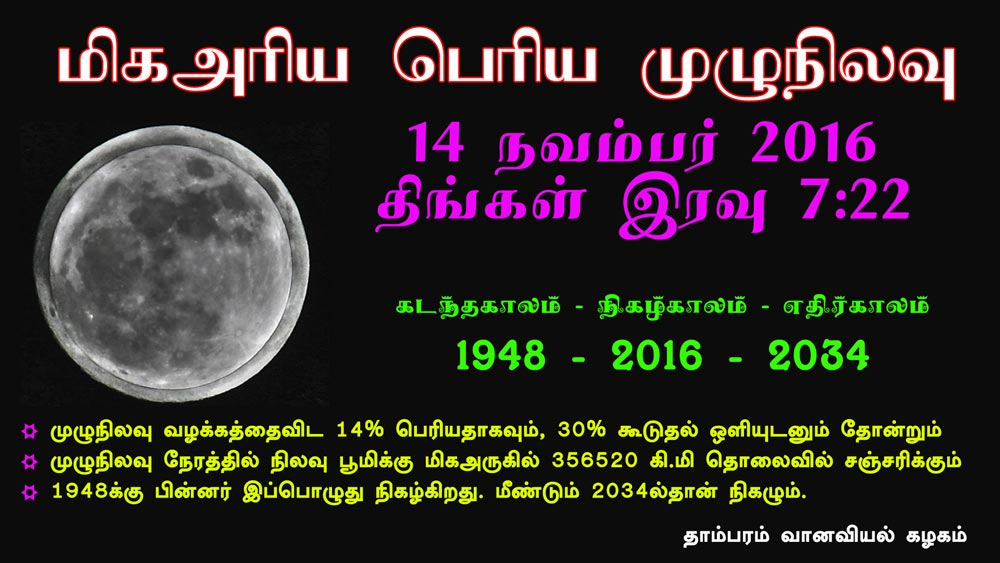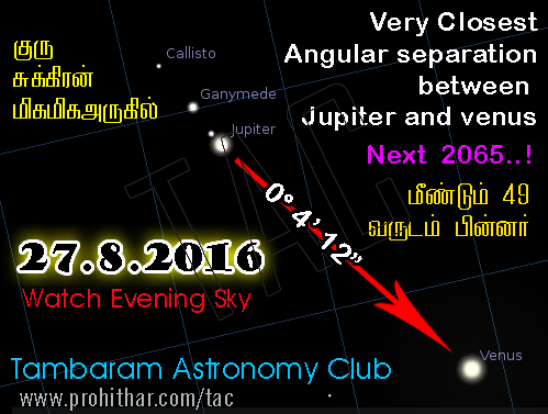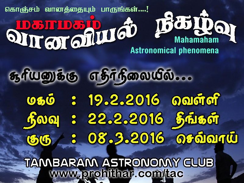 வானியல் தொடர்பான உலகத்தின் அதிகாரபூர்வ அமைப்பான "சர்வதேச வானியல் சம்மேளனம்" ( International Astronomical Union IAU ) தாம்பரம் வானியல் கழகத்தை அங்கீகரித்து அதனின் இணையத்தில் குழுநடவடிக்கை பகுதியில் வெளியிட்டு எம்மை கௌரவப்படுத்தியுள்ளது என்பதை இங்கு பணிவுடன் அறிவிக்கிறோம் முந்திய 2015ம் ஆண்டு நிகழ்வுகள் பற்றிய தொகுப்பு பக்கம் Leonids - meteor shower - comet Tempel–Tuttle Path - 2016 Nov 17 and 18 அதிகாலையில் விண்ணில் அழகிய எரிகல் ஒளிவெள்ளத்தை காணுங்கள். சிம்ம ராசி கூட்டத்தில் நவம்பர் 17, 18 ஆகிய தேதிகளில் ஆண்டுதோறும் காணலாம். மணிக்கு 20 எண்ணிக்கையில் இந்த எரிகல் வீழ்ச்சியை காணலாம். ஆண்டு தோறும் கூடி குறைந்து 30 வருட சுழறச்சியில் இருக்கும் (இது வால்நட்சத்திரத்தின் பாதையை பூமி கடப்பதால் ஏற்படும் நிகழ்வாகும்) Super Moon 14.11.2016 Monday, Nov. 14, promise a spectacular supermoon show. When a full moon makes its closest pass to Earth in its orbit it appears up to 14 percent bigger and 30 percent brighter, making it a supermoon. This month’s is especially ‘super’ for two reasons: it is the only supermoon this year to be completely full, and it is the closest moon to Earth since 1948. The moon won’t be this super again until 2034! very closest Jupiter conjunction with Venus on 27th Aug 2016 Mercury Transit Event Phots (High Resolution) Old Events சூரிய கிரகணம் 9.3.2016 புகைப்பட தொகுப்பு சென்னையில் 9.3.2016 அன்று தெரியும் சூரிய கிரகணம் (Solar Eclipse) இப்படித்தான் இருக்கும் Jupiter Opposition - குரு கிரகம் எதிர்நிலை - புகைப்பட தொகுப்பு வானத்தை காண வாருங்கள் Mahamaham Astronomical Phonemena மகாமகம் ஓர் வானியல் நிகழ்வு மகாமகம் என்பது புவிமைய கோட்பாட்டின்படி சூரியனுக்கு எதிர் நிலையில் நிலவு, வியாழன் கோள், மகம் (Regulus)நட்சத்திரம் வரும் வானியல் நிகழ்வாகும் மகாமகம் என்பது வானவியலில் மிகமுக்கிய நிகழ்வுகளில் ஒன்றாகும் சூரியன் - பூமி - நிலவு - குரு - மகம் ஆகிய 5 வானியல் பொருட்களும் நேர்கோட்டில் வருவது பலாயிரம் கோடி ஆண்டுகளாகும். ஏனெனில் சூரிய - பூமி பாதையில் இருந்து மகம்(HR 3982) Declination +9° 13' 16" நிலையில் உள்ளது இது -18.64" அளவிற்கு வருட மாற்றம் உள்ளது, இதன் ஆண்டு சலனம் Anual Variation & Proper motion மிககுறைவாக உள்ளதால் பலாயிரம் ஆண்டுகளுக்கு பின்னர் மட்டுமே நிஜமான மகாமகம் நிகழ வாய்ப்புள்ளது. இதனிடையில் அண்டவெளி சுழற்சி, பிரபஞ்ச விரிவு ஆகிய வற்றால் இதுபோன்ற வானியல் நிகழ்வு நடைபெறும் என்பதை உறுதியிட்டு கூறமுடியாது சூரியனுக்கு எதிர்நிலையில் நிலவுவரின் அது பவுர்ணமி என்று அழைக்கப்படுவது போல் குரு எதிர்நிலையில் வரும் காலமும் "குரு பவுர்ணமி" என்று அழைக்கலாம். இந்த நாளில் குருவின் முழுவிட்டமும் தெளிவாகவும் அதன் துணைக்கோள்(சந்திரன்கள்) அழகாகவும் தெரியும். இதை சக்திவாய்ந்த பைனாகுலர், வானியல் தொலைநோக்கிகளில் காணலாம். நிலவு வியாழன் கோள் , மகம் நட்சத்திரத்தை மறைத்தால் அது Lunar Occultation என அழைக்கப்படும். இந்த நிகழ்வை உலகின் சில பகுதிகளில் மட்டுமே தெரியும். இது குறித்து அறியகீழ்கண்ட இணைப்பை பார்வையிடவும். குறி